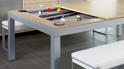 See the video at:http://www.youtube.com/watch?v=Qwl_aQZHBbEFunctional and with a timeless modern design, the Fusion table offers generous dimensions for relaxed dining with family or friends. Hosting up to 10 people in its standard configuration, the Fusion table is perfect for those precious family and friend reunions.After dinner, in just a couple of minutes, the Fusion table transforms in a high quality pool table. Simply push the optional assorted benches under the table, lift the 3 table top sections, and find the cues, Aramith balls, triangle and chalk readily waiting for you to start the game.The Metal Fusion table consists of an aluminum color steel structure, and a variety of wooden veneered table tops. Fingerprint-proof stainless steel is available as an option. Includes cloth and accessory package.The Fusion table features the Easy-Lift mechanism. In each leg of the table, a spring-assisted system allows just about anyone to lift the table 3" with minimal effort. The high precision mechanism auto levels the table and is equipped with an auto-lock device that assures maximum stability and steadiness. Specifications: Table outside dimensions: 52.8" x 90.6" ; height: 29.5" Playing area: 37.8" x 75.6"This model has a white oak finish on top rails and dining top.